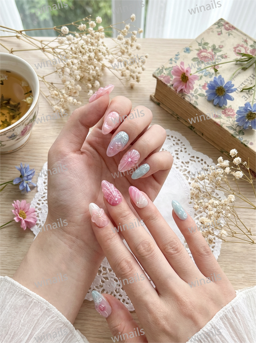 Step into a whimsical underwater world with our 3D Mermaidcore Stiletto Press On Nails. This enchanting set features a dreamy pastel ombre palette of soft pinks and baby blues, adorned with intricate 3D seashells, delicate floral appliqués, and lustrous pearl accents that mimic the iridescent beauty of the ocean.