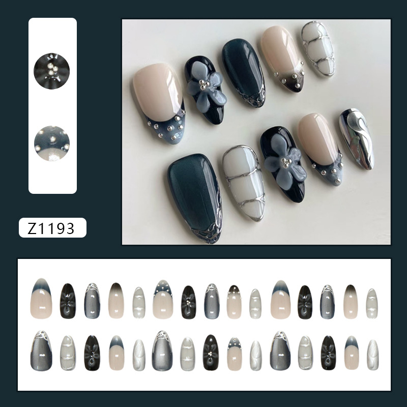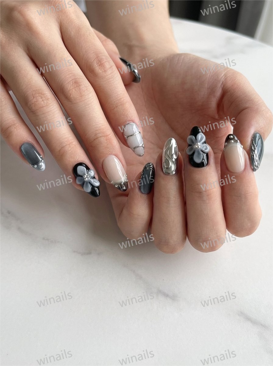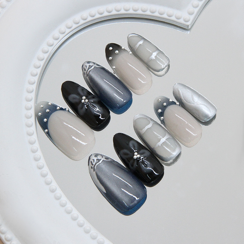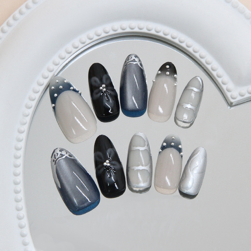 Blue Flower Chrome Press-On Nails features soft decorative nail art with a romantic seasonal feel with blue chrome accents. It works especially well for spring dressing, vacations, gift moments, brunches, and romantic styling.