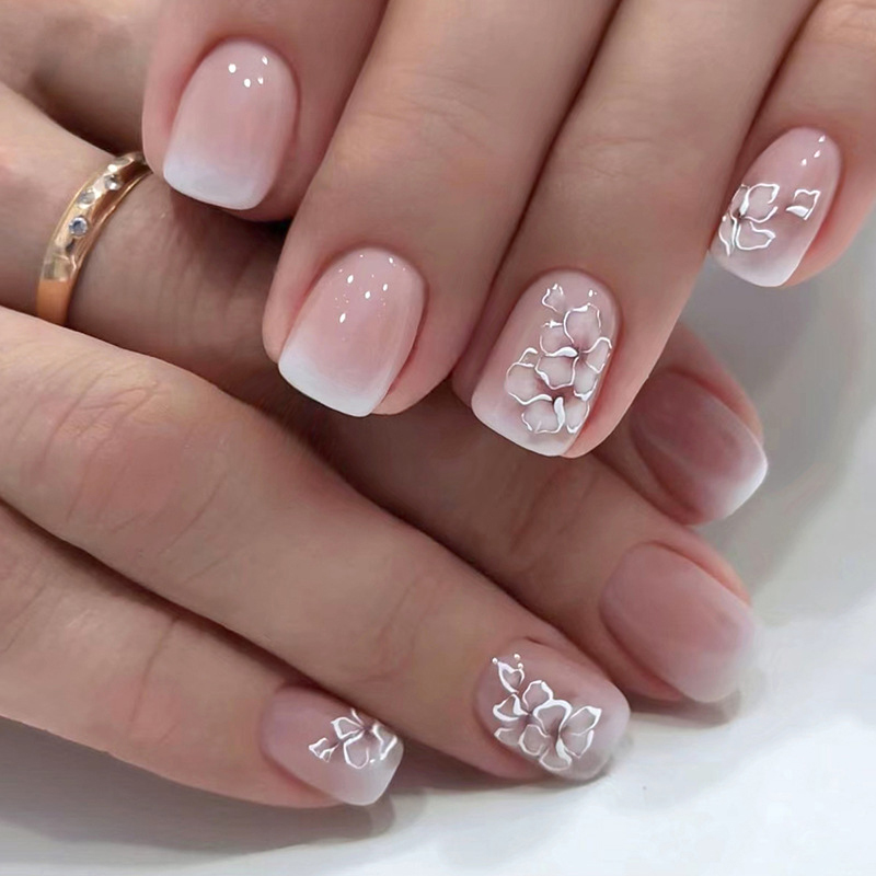 Nude French Flower Press-On Nails features crisp tip contrast and a refined salon-inspired look with nude flower accents. It works especially well for bridal plans, date nights, workdays, and dressier events.