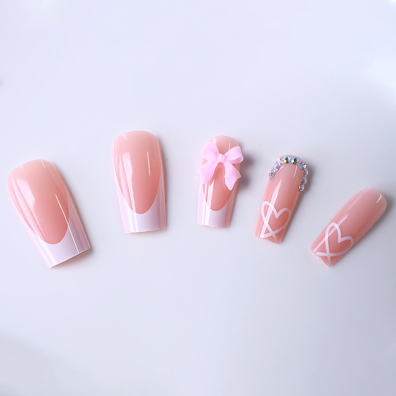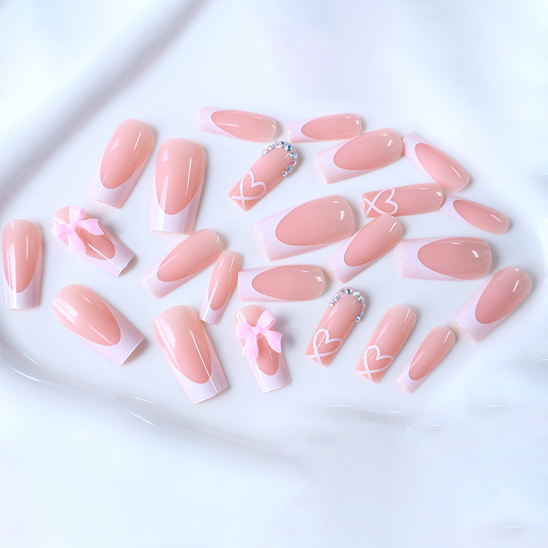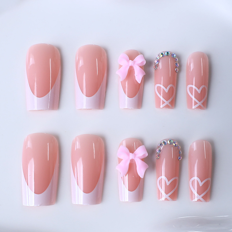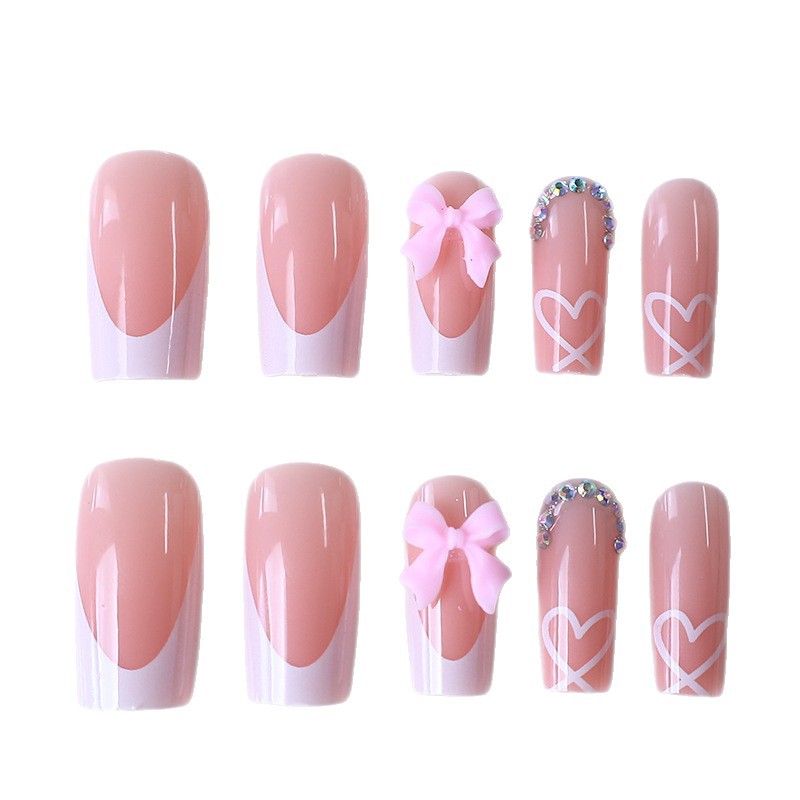 Pink Bow Heart French Press-On Nails features crisp tip contrast and a refined salon-inspired look with pink bow heart accents. It works especially well for bridal plans, date nights, workdays, and dressier events.