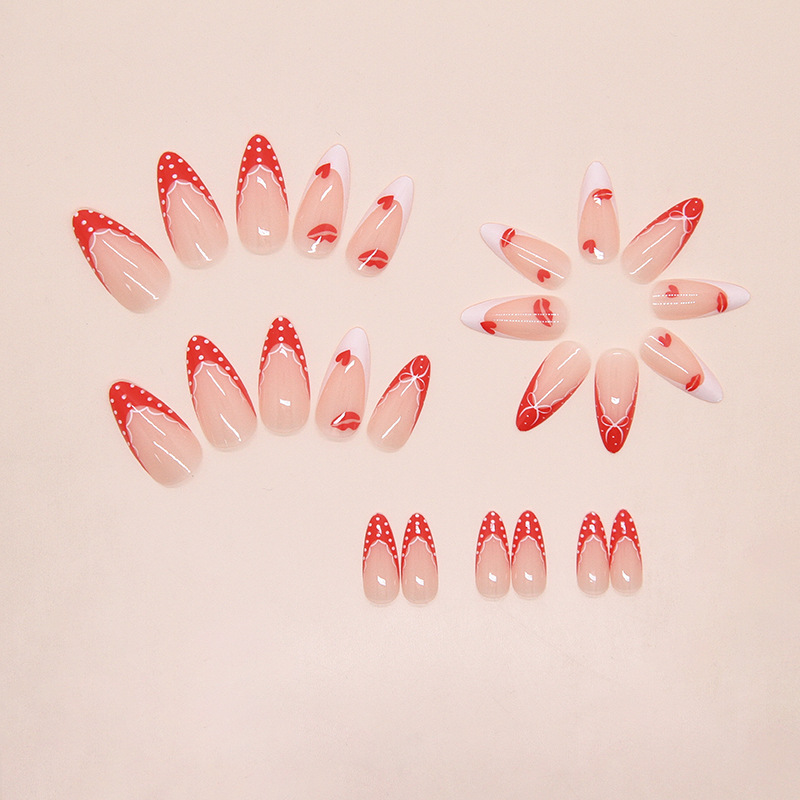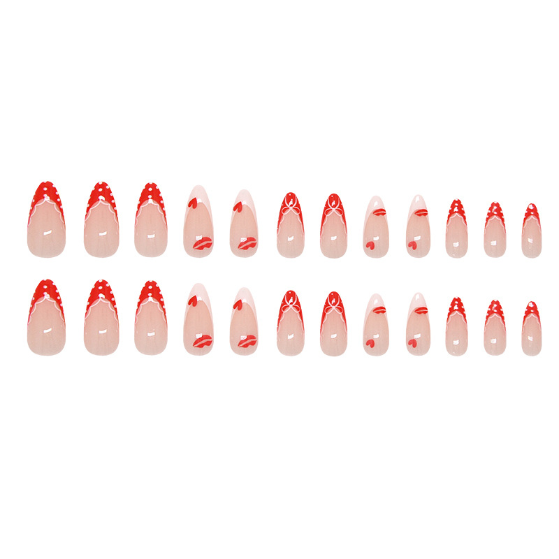Unleash your inner hot girl with our show-stopping Red Lip & Heart Press On Nails. Departing from minimalism, this set features a dramatic stiletto (coffin) shape adorned with playful yet seductive designs—including 3D-effect red lips, dainty love hearts, classic polka dots, and a chic red-and-white French tip reverse.